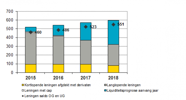 De ontwikkeling van de bestaande leningenportefeuille tendeert op basis van de huidige ramingen per saldo naar € 550 miljoen. Deze stijging wordt voor een belangrijk deel veroorzaakt door de investeringsplanning van het MIP en het investeringsfonds in de komende jaren. De lange leningenpositie (opgenomen en uitgezet) is door het gebruik van swaps om renterisico's af te dekken een kleiner deel gaan uitmaken van de totale financieringsbehoefte van de gemeente. Onder de swaps worden rentetypisch kortlopende leningen (kasgeld of roll-over) aangetrokken.